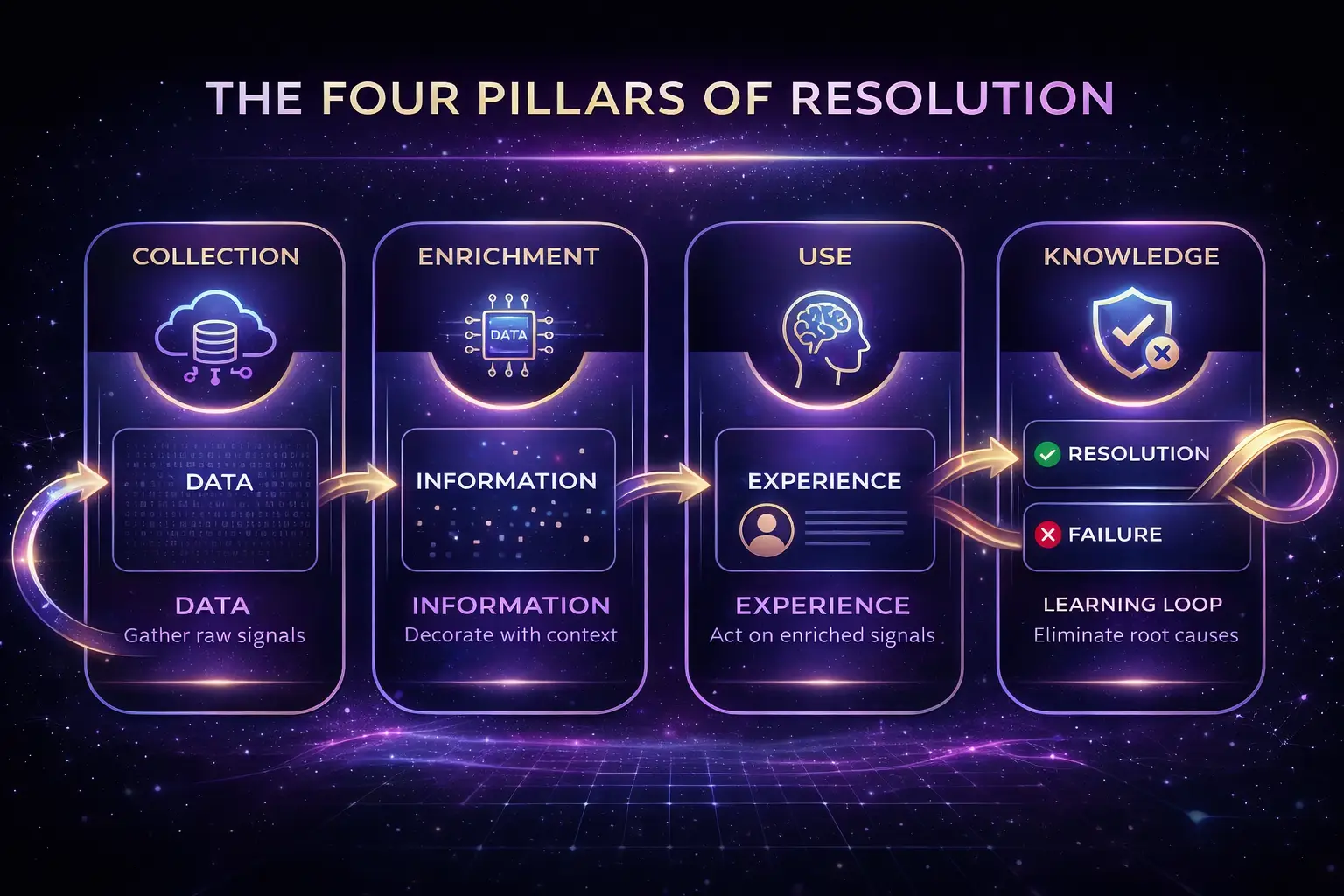 In The Resolution Economy™, raw data is not enough. Experience alone is not enough. AI layered on top of chaos only accelerates failure.Many organizations try to deploy AI at theCollection stage, hoping algorithms will magically fix disconnected systems but they won’t.To succeed, organizations must move through a unified flow: